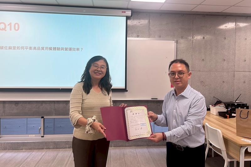 南大經營與管理學系蕭詠璋主任代表學系致贈感謝狀,感謝碳佐麻里精品燒肉集團對本次產學交流的大力協助。