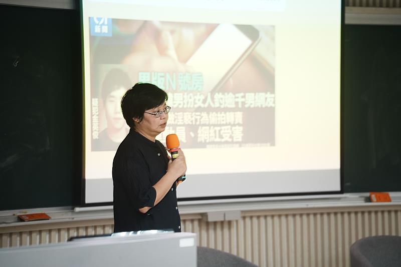 她接著說明我國「小玉Deepfake」事件,指出「AI已不再只是少數人善用科技的工具,而是任何人都可能用來作惡的手段」,深偽影像不僅逼真難辨,更能被快速量產、複製與散布。隨後提及南韓「新版N號房」事件,深偽技術被用來大量製作不實性影像,甚至以「國中生」、「大學生」、「師生」等標籤分類販售,部分受害者與加害者素未謀面,卻被迫成為影像中的主角,內容令在場同學深感震撼。